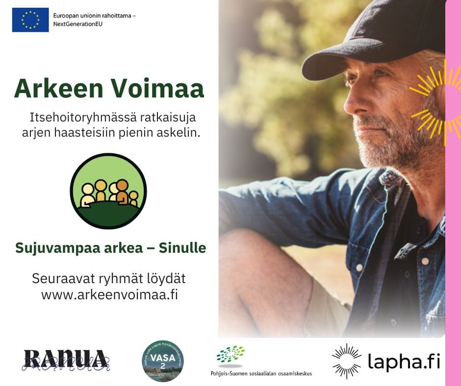Etäyhteyksin toimivat Arkeen Voimaa -ryhmät sopivat sinulle, jos koet itsesi kuormittuneesi, uupuneeksi, yksinäiseksi tai kärsit pitkäaikaissairaudesta tai olet sairastavan läheinen. Etäryhmiin voit osallistua mistä päin Lappia tahansa. Ryhmät ovat maksuttomia ja kaikille avoimia. Et tarvitse lähetettä, tietokone mikrofonilla ja kameralla riittää! 📅 Teams-ryhmiä järjestetään ympäri vuoden. Katso ajankohdat ja ilmoittaudu mukaan: arkeenvoimaa.fi