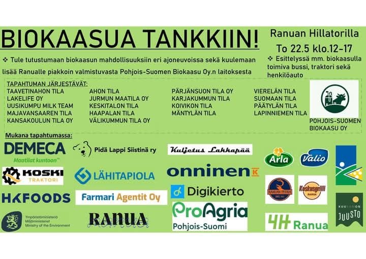 Tule tutustumaan biokaasun mahdollisuuksiin eri ajoneuvoissa ja kuulemaan lisää Ranualle piakkoin valmistuvasta Pohjois-Suomen Biokaasun Oy:n laitoksesta.