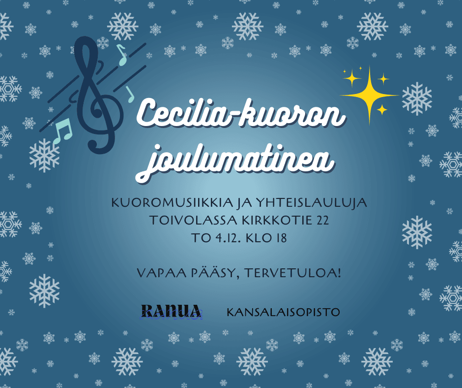Kansalaisopiston Cecilia-kuoro sekä kuoronjohtaja Anni Pätsi kutsuvat viettämään kanssaan jouluista musiikki-iltaa.