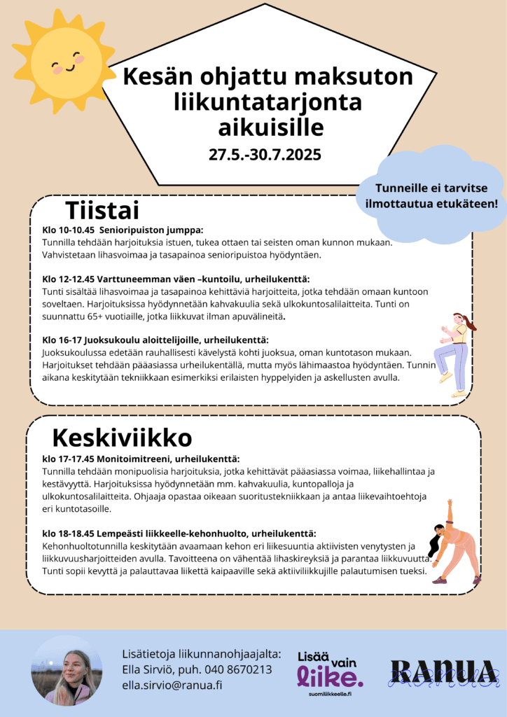 Ohjattua maksutonta liikuntatarjontaa aikuisille. Sisältää mm. jumppaa, kuntoilua, treeniä, juoksukoulua ja kehonhuoltoa.