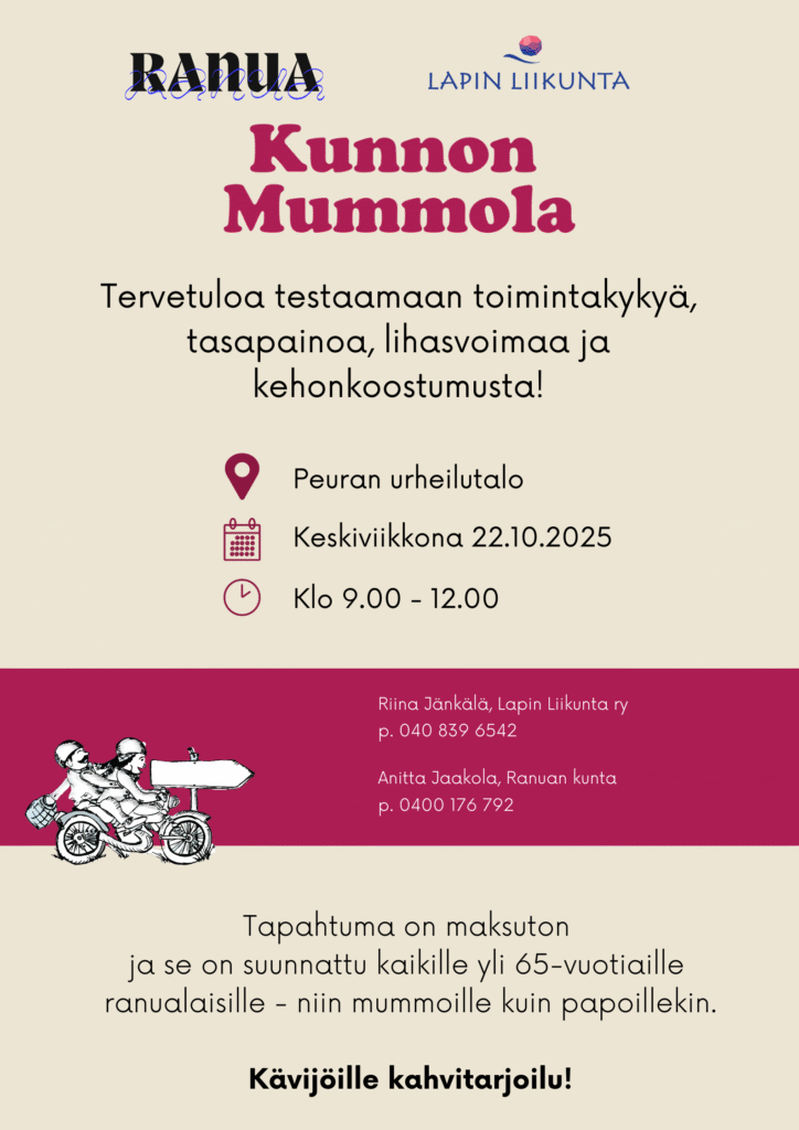 Yli 65-vuotiaille suunnattu lihasvoimaan ja tasapainoon keskittyvä Kunnon Mummola -tapahtuma saapuu jälleen Ranualle!