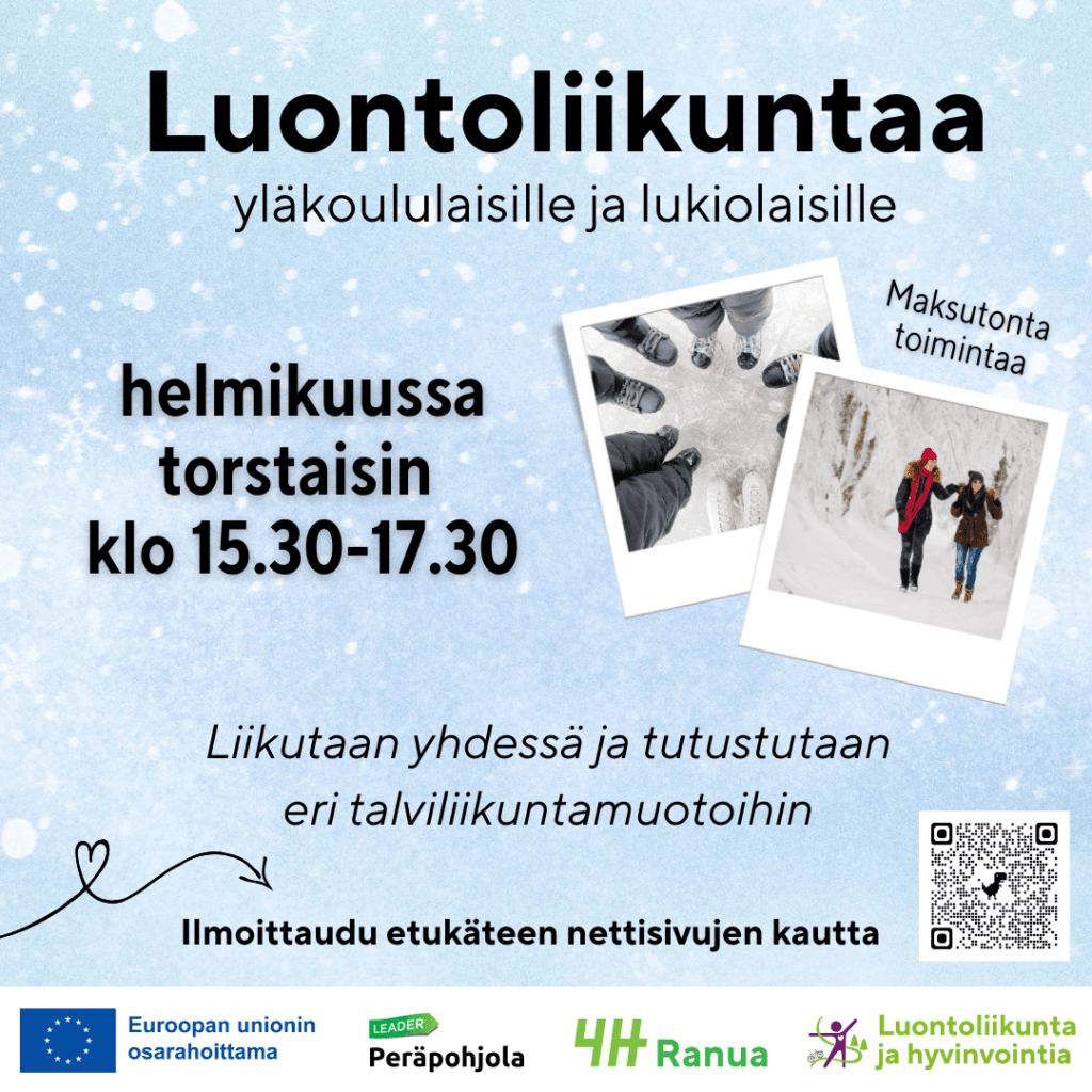 Luontoliikuntaa -kurssi on suunnattu yläkoululaisille ja toisen asteen opiskelijoille, jotka haluavat tutustua luonnossa liikkumisen eri muotoihin. Kurssilla ulkoillaan yhdessä rennolla fiiliksellä. Kurssi kokoontuu helmikuun ajan torstaisin klo 15.30-17.30. Voit osallistua yhdelle tai useammalle kerralle. Kurssi on maksuton. Ilmoittaudu kurssille nettisivujen kautta: https://ranua.4h.fi/hankkeet/luontoliikunta-ja-hyvinvointia-hank/tulemukaantoimintaan/luontoliikuntaa/ Tervetuloa mukaan innostumaan luonnosta!