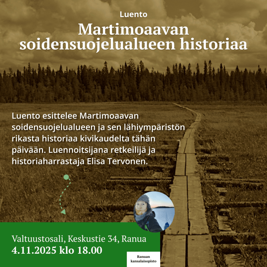 Luento on aikamatka Martimoaavan soille ja metsille, jotka ovat toimineet vuosituhansien ajan alueen asukkaiden pyyntialueina ja elinympäristönä. Alueen erämaita ovat hyödyntäneet myös jääkärit ja pirtukaravaanit salaisilla retkillään. Luennolla tutustutaan myös miten alueesta on muodostunut yksi Pohjois-Suomen tärkeimmistä soidensuojelualueista ja suosittu retkikohde.
